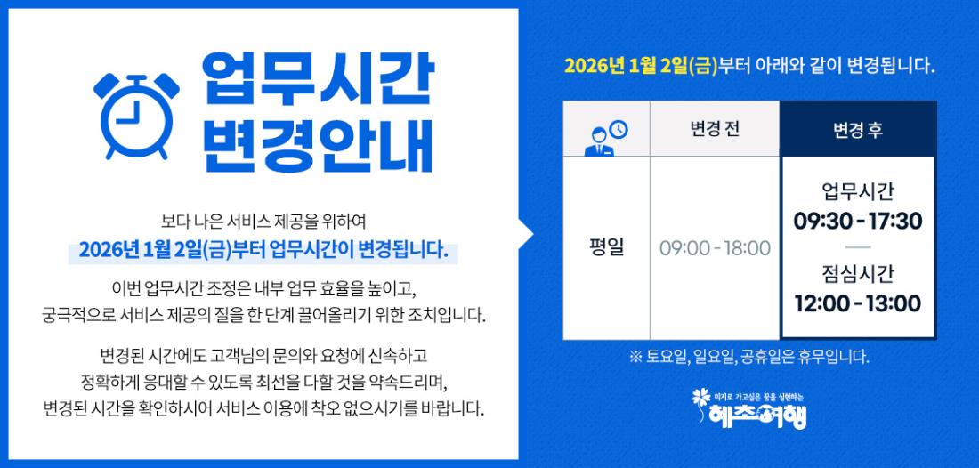 [공지] 혜초여행 업무시간 변경안내 (2026.01.02 시행)