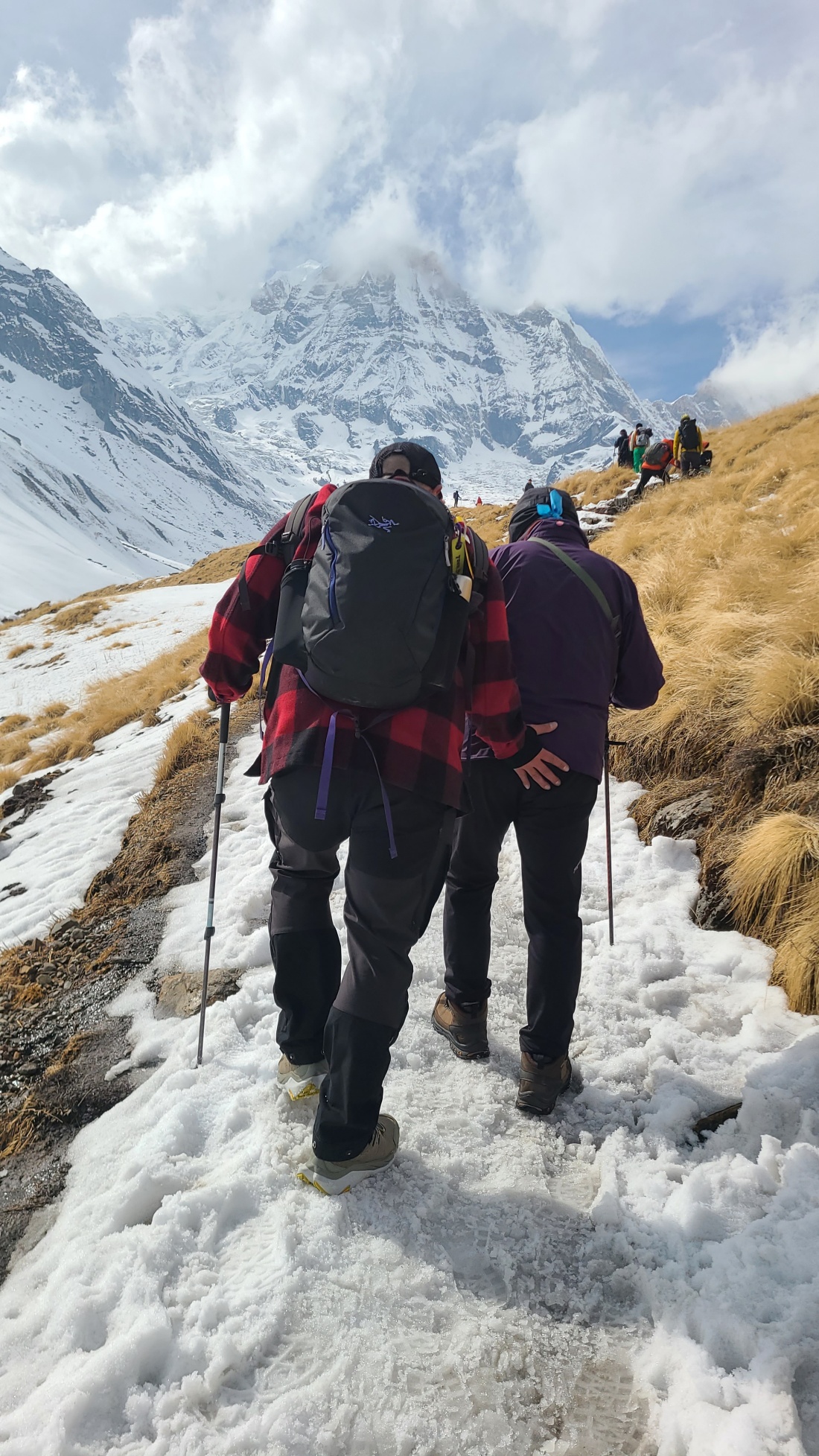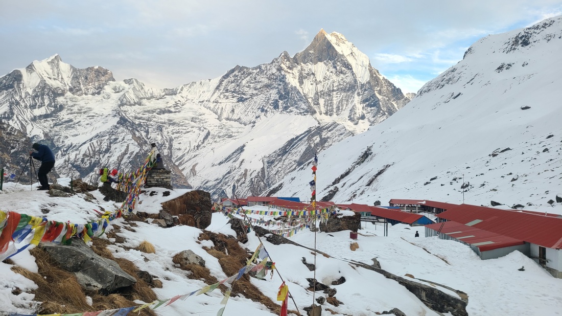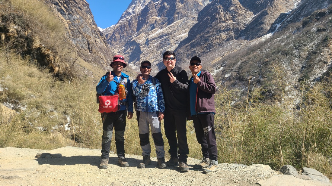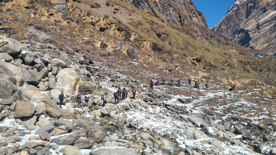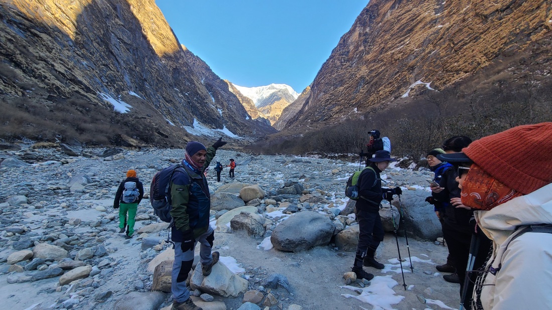 그늘진 낙석 구간을 지나 ABC로 향했습니다. 메인가이드 지반이 주변 봉우리들을 설명하며 참가자분들의 이해를 도왔고, 드디어 안나푸르나 남봉이 모습을 드러냈습니다. 오후부터 기상이 흐려질 예정이었지만, 오전에는 맑은 하늘 아래 장엄한 풍경을 감상할 수 있었습니다.