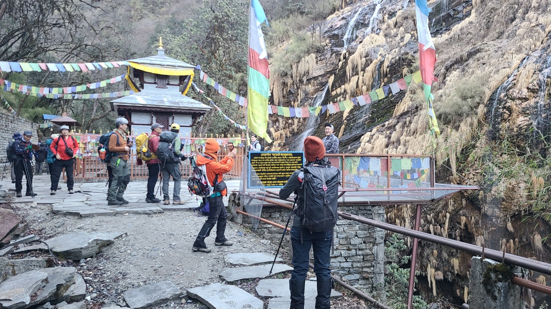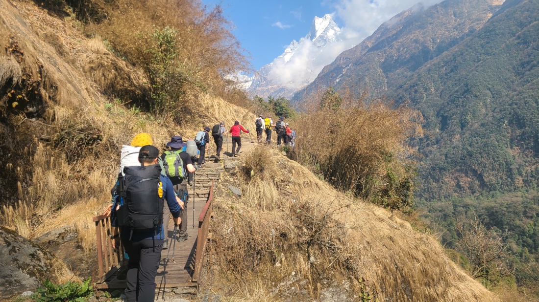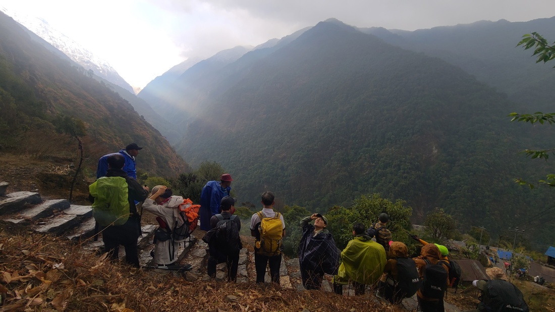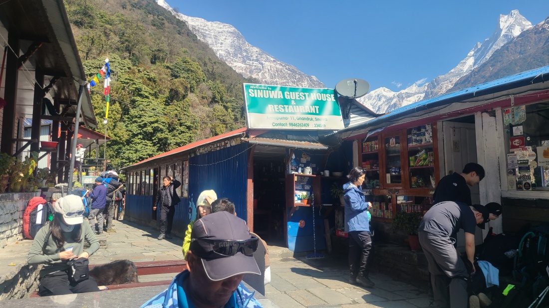 전날 비로 인해 날씨가 걱정되었지만 건기 시즌답게 아침에는 맑게 개었습니다. 숙소 앞에서는 히운출리와 마차푸차레의 웅장한 모습이 한눈에 펼쳐졌고, 히말라야 트레킹의 매력을 다시 한번 느낄 수 있는 순간이었습니다.