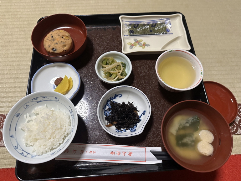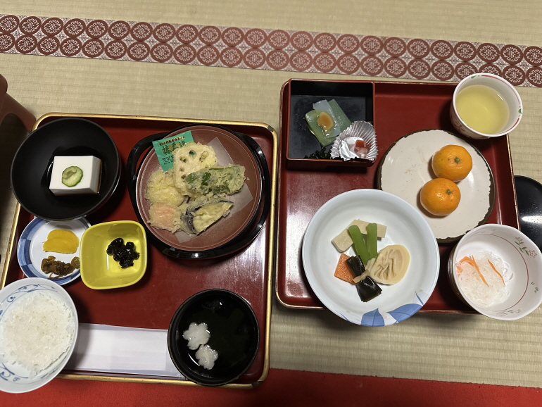 참때두부, 단무지, 콩조림, 튀김, 국물, 한천등을 이용한 요리가 나오고 와카야마의 명물 귤이 함께 제공됩니다.