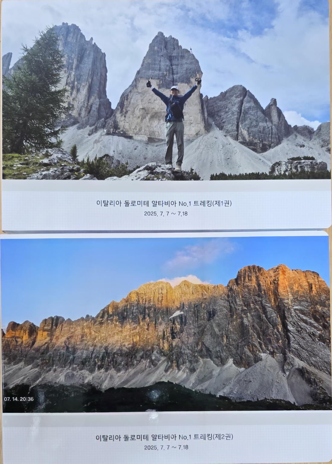 검토하던 중에 주변 지인들이 돌로미티의 풍경이 매일매일 새롭다고 추천하여 TMB 수준으로 생각하고, 과감히 알타비아 No.1의 트레킹에 도전하기로 하기로 했다. 나이도 있고 해서 참가자들의 개개인의 능력에 따라 케어를 아주 잘 해준다는 혜초여행사를 믿고 출발 6개월 전에 일찌감치 예약을 하고 남들에게 민폐를 끼치지 않기 위해 나름대로 전지훈련 및 체력 준비를 했다. 트레킹 첫날에 TMB와 또 다른 감흥을 느끼면서 출발을 하였다. 하지만 산을 넘는 도중에 다름 참가자들과 보조를 맞춰 걷다 보니, 오버 페이스가 되어 매우 힘들었다. 여행사의 인솔자(우리의 대장)가 나의 컨디션을 파악하고, 내 배낭의 일부 짐을 당신의 배낭으로 옮겨서 배낭을 무게를 줄여주니, 숨통이 트여 첫날 트레킹을 잘 마무리할 수 있었다. 그래도 힘든 과정에서 틈틈이 경치를 보면서 힐링하고 많은 사진도 남겼다. 트레킹 셋째 날 코스(라가주오이)는 가장 길고 난 코스가 있지만, 경치는 알타비아 No.1에서 핵심 경치라 한다. 하지만 첫날의 오버 페이스로 컨디션이 좋지 않아서 민폐를 끼치지 않으려고, 우리의 대장에게 허락을 받고 카고백을 배달해 주는 차량을 이용하여 다음날 산장으로 곧바로 이동했다. 물론 별도의 비용을 기사에게 지불했다. 산장에 도착하니 가까운 곳에서 라가주오이를 오르내리는 케이블카가 운행 중인 것이 보였다. 무조건 걸어서 케이블카 승차장으로 가서 매표를 하고 정상에 올랐다. 360도 파노라마를 볼 수 있었고, 역시 알타비아 No.1의 핵심 경치라 할 수 있었다. 일행들이 올라 오기를 기다려서 함께 하산하려고 했으나 날씨가 추워서 먼저 케이블카로 하산하였다. 하루를 쉬어서 그런지 4, 5일차는 그리 어렵지 않게 트레킹을 하였다. 6일차는 여행사에서 카고백을 배달해 주지 않아 하루치 짐을 배낭에 추가로 담고 힘든 코스인 '티씨 산장'을 오르는데, 비가 와서 우위를 입었다 벗었다 하면서 힘들게 일행 중에서 맨 꼴찌로 올랐다. 너무 피곤하여 코인을 넣고 샤워하는 경험을 쌓지 못했다. 그렇게 피곤하였는데도 시차로 인하여 새벽녘에 눈이 떠져서 밖을 나가보니 달과 별이 있었고, 곧 일출을 볼 수 있을 것 같아 추위를 견디면서 잠깐 기다리니 해발 2250m에서 일출을 볼 수 있었다. 전날의 고생에 대한 보상을 받은 것 같았다. 알타비아 No.1 트레킹 마지막 날(7일차)은 하산길이다. 거의 1000m 이상을 내려오는 코스다. 그동안 거의 돌산 중심의 경치를 보다가 나무숲이 있는 경치를 보았다. 점심때쯤 No.1 코스를 마치고 여행사에서 돼지 목살 바비큐와 김치, 쌈장를 맛보게 해주었다. 우리의 대장이 철저한 준비를 한 것으로 보였다. 역시 혜초여행사다 !!! 대장이 점심이 마무리되는 시점에 갑자기 최연장자로서 소감 한마디 하라고 한다. 갑자기 뜬금없어 당황했지만, 3일차 트레킹을 쉬면서 이제는 이런 무모한 트레킹 여행은 포기해야지 마음먹었었는데, 막상 트레킹을 완주하고 나니 마음이 바뀌어 80세까지 이렇게 다니고 싶다는 희망을 얘기했다. 그동안 눈으로 즐겼던 것을 다양하게 사진에 담았고, 그리고 마음으로 느껴던 것을 묶어서 사진 앨범을 제1, 2권으로 제작하였다. 앨범 내용 전체를 후기에 올리려고 했으나, 사이트 특성상 올릴 수가 없어서 앨범을 사진으로 찍어 일부만 올립니다. 이 앨범을 볼 때마다 여행을 다시 하는 생생한 느낌이 든다. 주변의 70대들에게 돌로미티 트레킹을 적극 추천하려고 하며, 나는 또 다른 트레킹 코스를 혜초여행사와 함께 해보려 한다...