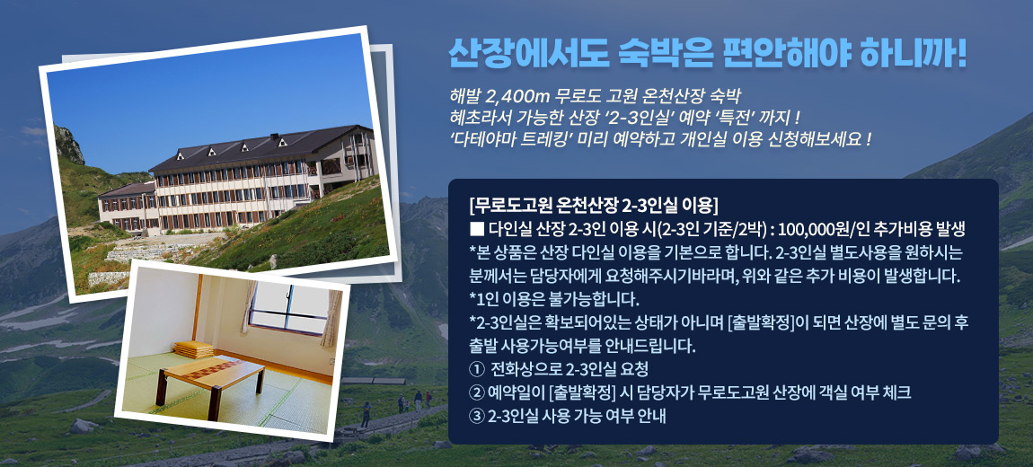 ※ 2-3인실은 확보되어있는 상태가 아니며 [출발확정]이 되며, 산장에 별도 문의하여 예약 후 출발 사용가능여부를 안내드립니다.