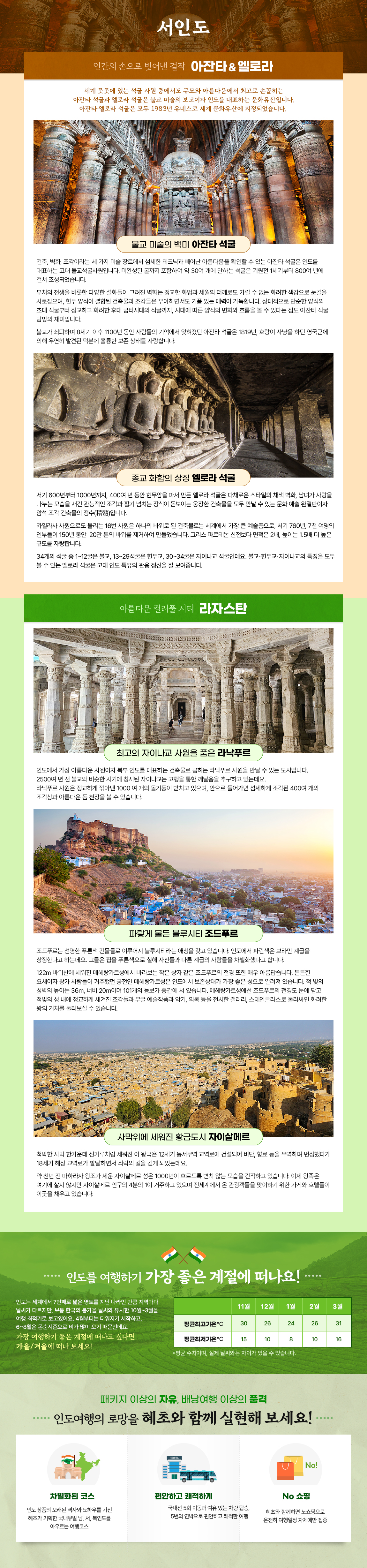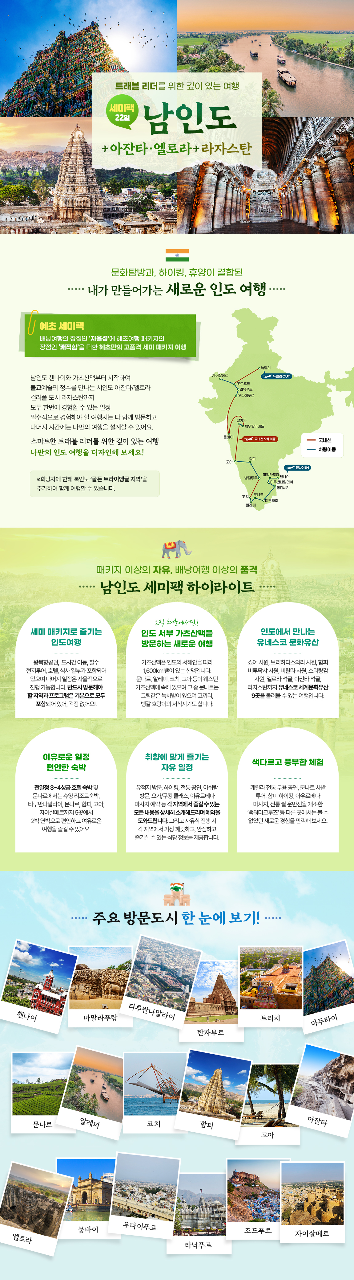 인천-첸나이-마말라푸람-티루반나말라이-탄자부르-트리치-마두라이-문나르-알레피-코치-방갈루르-함피-후블리-고아-잘라곤-아잔타-아우랑가바드-뭄바이-우다이푸르-라낙푸르-조드푸르-자이살메르-조드푸르-델리-인천