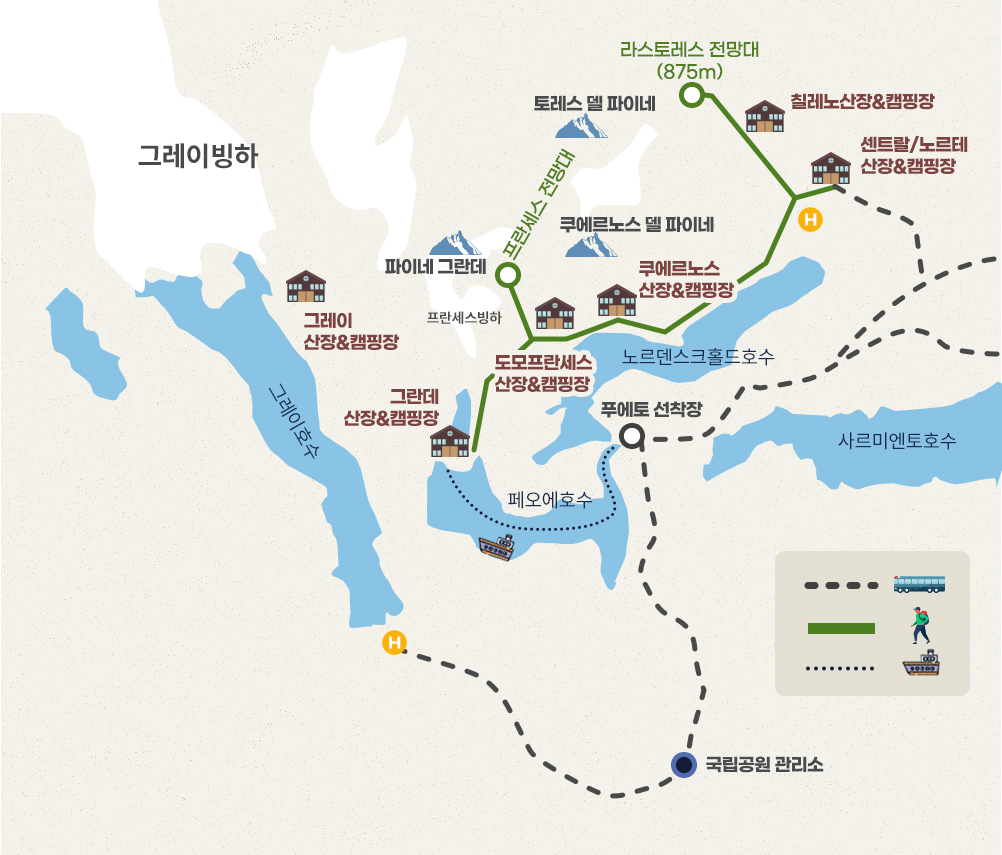 ★ 토레스 델 파이네 국립공원 내 산장&캠핑은 한정적인 장소에 전세계에서 예약하는 대상지인 만큼 예약하시는 시기에 따라 산장 또는 캠핑(텐트 이용)으로 예약될 수 있음을 알려드립니다.