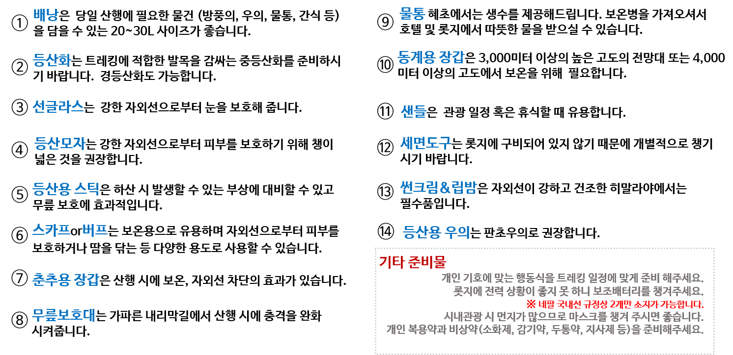 히말라야 트레킹 일정은 평균 고도 2,000m~5,000m이상의 고산 트레킹 프로그램으로 고산증 등의 위험성이 항시 내재되어 있습니다. 해당 트레킹 참가에 있어서 트레킹 일정을 정상적으로 수행하기 위한 신체적, 정신적 결격사유가 없어야 하며 특수한 경우에는 의사의 소견을 받아 참가여부를 결정 해주시기 바랍니다. 그리고 개인의 건강상태 및 특수한 상황에 대해서는 담당자에게 내용을 공유해주시고 공유하지 않아 발생하는 사항에 대한 책임은 본인에게 있습니다.
