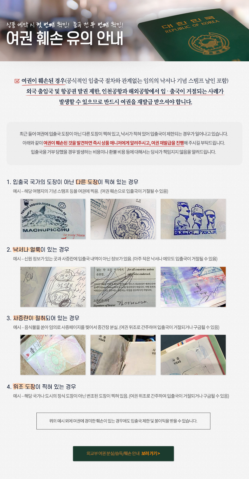 여권 잔여 유효기간(6개월) 부족, 여권 사증란 부족(8페이지 이하)한 경우 출입국 및 항공권 발권 등에 제한이 있을 수 있으므로 출발 전에 반드시 여권을 확인하여 주시기 바랍니다.