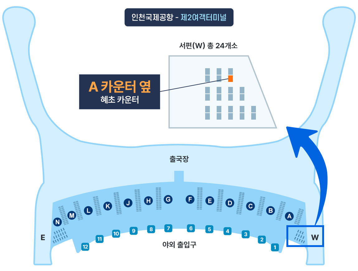 인천공항 제2여객터미널 3층 A카운터 옆 혜초여행사 미팅 테이블 집결