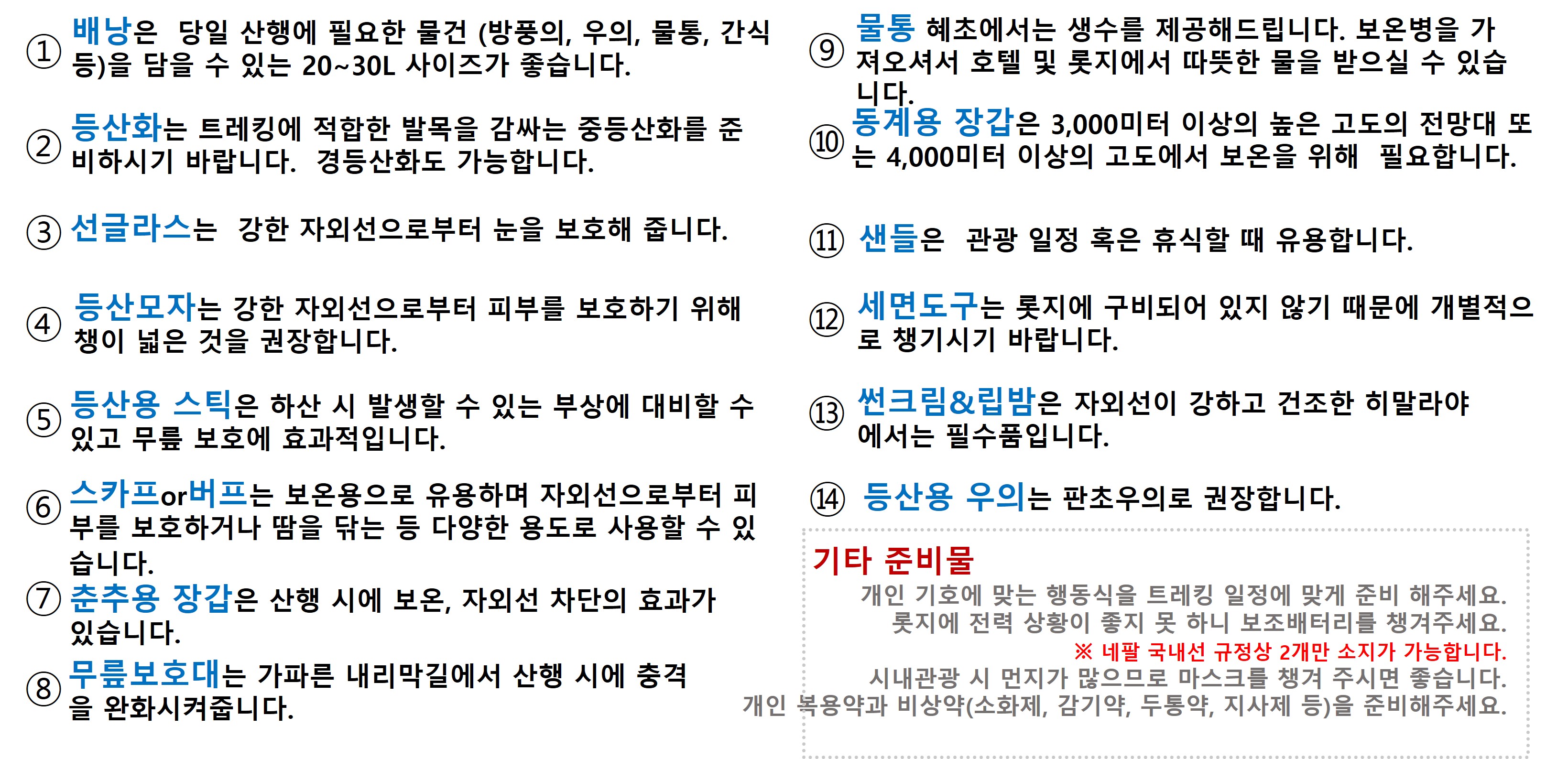 산행 대상지 국가의 산행 규정을 준수해야 하며 현지 트레킹 코스를 관리하는 공식적인 기관에서는 안전을 위해 트레킹 구간을 통제하는 경우도 있습니다. 이에 대하여 불가피하게 일정을 변경하는 경우에는 참가 고객들에게 상황을 알리고 이에 대한 대안일정으로 준비하여 안내하고 진행하겠습니다.