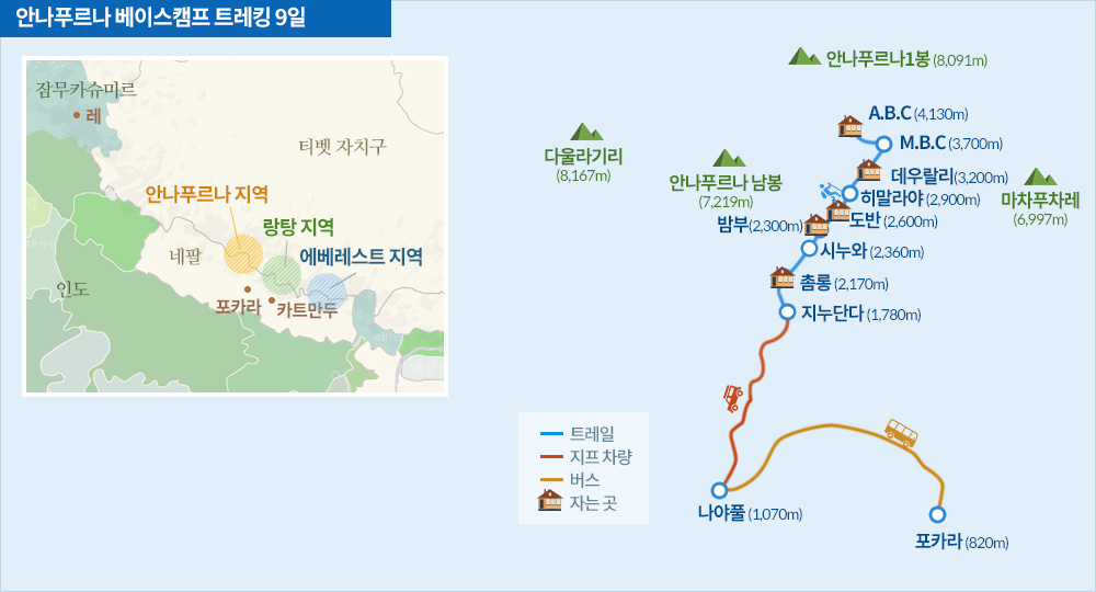 ■ 일정상의 숙박 [호텔, 산행 중 롯지/2인 1실 기준], 식사, 전용차량