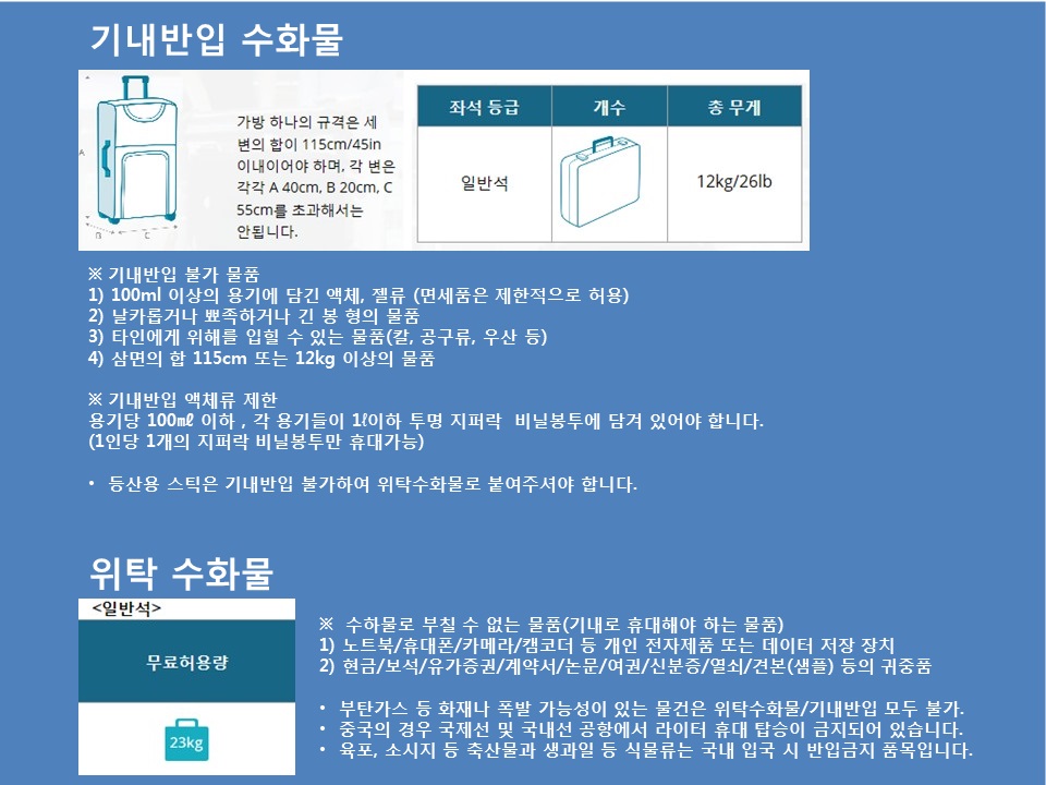수하물 탁송시 각 항공사 규정에 따라 보상 불가한 경우가 있으므로, 귀중품과 현금은 반드시 휴대하셔야 합니다.