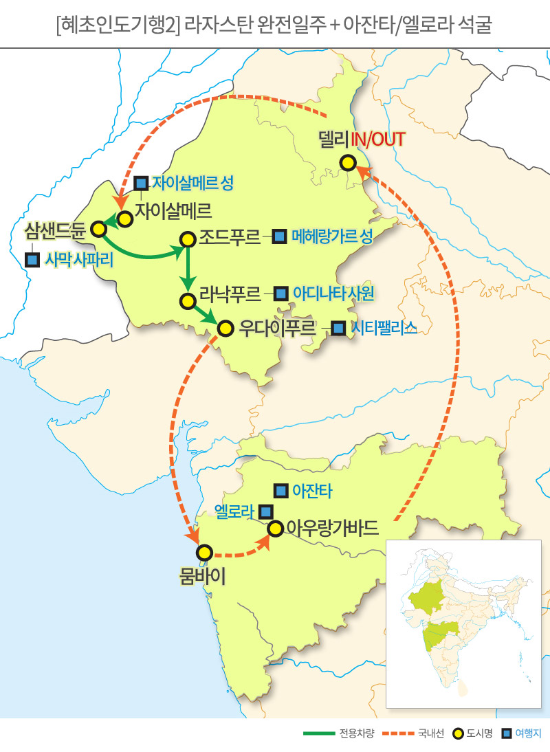델리-자이살메르-쿠리사막-조드푸르-라낙푸르-우다이푸르-뭄바이-아우랑가바드-델리