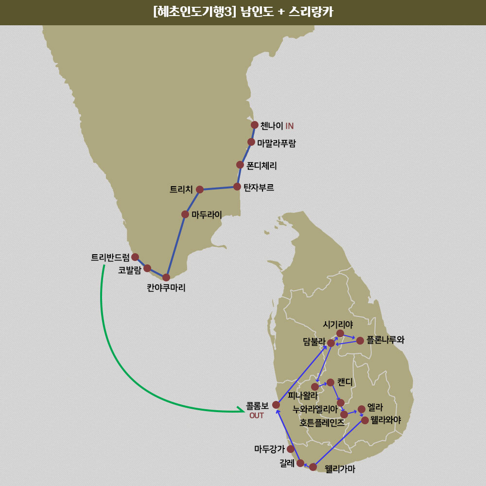 인천-콜롬보-첸나이-마말라푸람-탄자부르-트리치-마두라이-칸야쿠마리-코발람-트리반드럼-콜롬보-아누라다푸라-담불라-시기리아-플론나루와-담불라-캔디-누와라엘리야-호튼플레인즈-누와라엘리야-콜롬보-인천