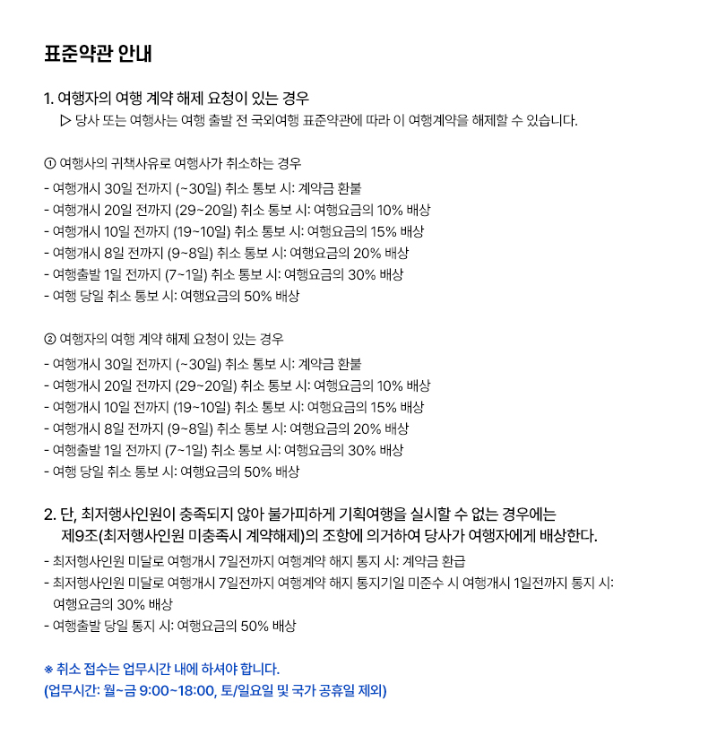 ■ 국외여행 표준약관 제11조(여행요금의 변경)에 의거하여 국외여행을 실시함에 있어서 이용운송 숙박기관에 지급하여야 할 용금이 계약체결시보다 5%이상 증감하거나 여행요금에 적용된 외화환율이 계약체결시보다 2% 이상 증감한 경우 여행사 또는 여행자는 그 증감된 금액 범위 내에서 여행요금의 증감을 상대방에게 청구할 수 있다.