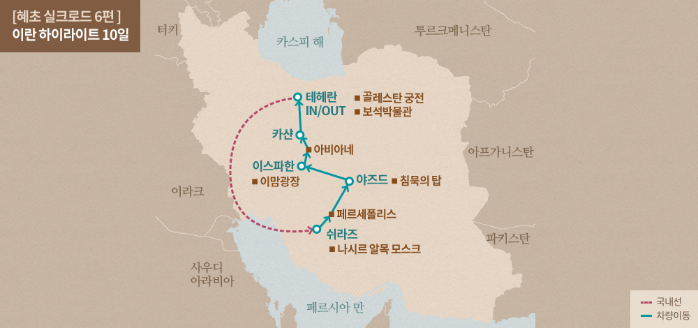 인천-이스탄불(경유)-테헤란-쉬라즈-페르세폴리스-야즈드-이스파한-아비아네-카샨-테헤란-이스탄불(경유)-인천