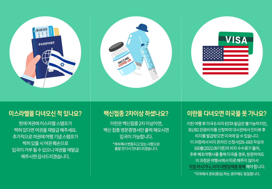 이란 여행시, 이스라엘 입/출국 도장이 여권에 찍혀있으면 여권을 재발급 받으셔야 하므로, 이스라엘을 방문한 적이 있는 분은 반드시 담당자에게 말씀해주세요.
