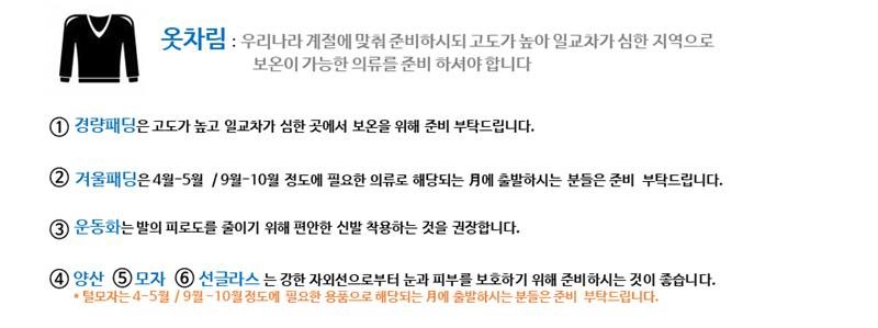 1) 기상상황, 천재지변으로 인한 일정 변경 시 추가비용 (숙박, 식사, 항공 등)은 본인(여행자)이 지불하게 됨을 미리 안내해드립니다.