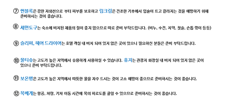 여행일정 중 발생할 수 있는 모든 안전사고에 유의하시기 바라며, 가이드의 안내사항 및 안전수칙 준수하기 바라며, 여행자 본인의 과실로 인한 안전사고는 본인이 책임을 지게 됩니다.