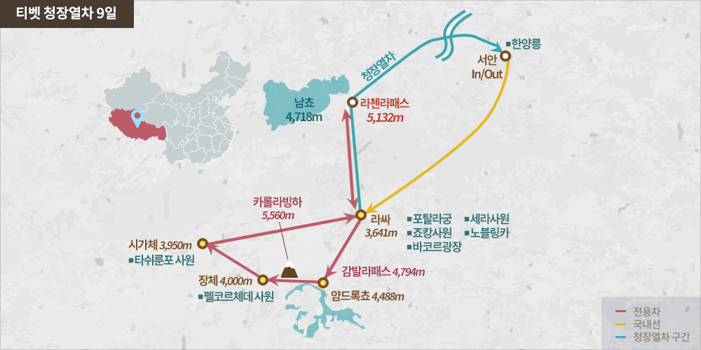 인천-서안-라싸-체탕-암드록쵸-장체-시가체-담슝-라싸-서안-인천