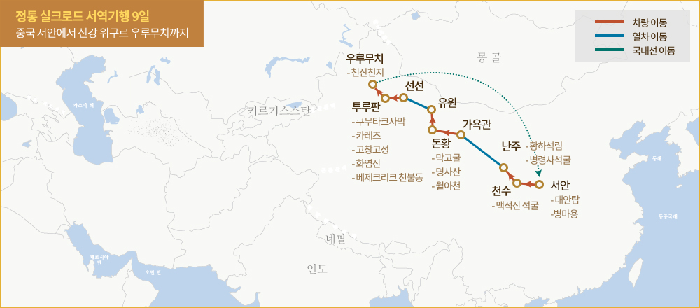 서안-천수-난주-가욕관-돈황-유원-선선-투루판-우루무치-서안