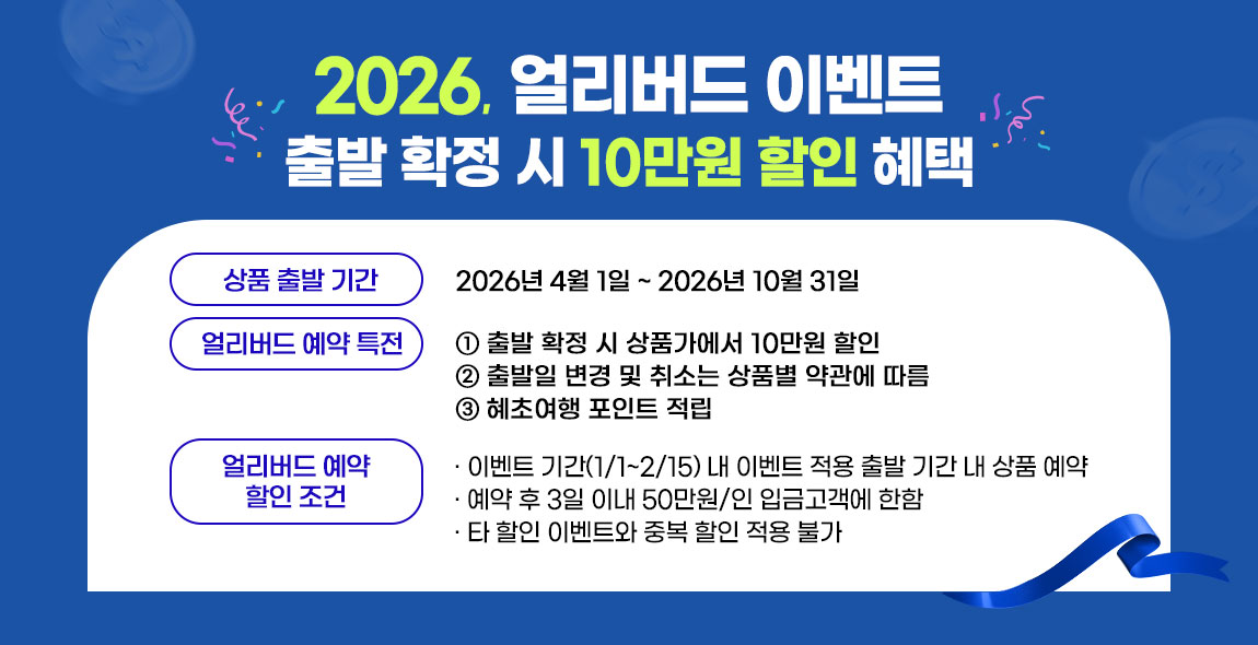 * 해당 상품은 패키지 여행 상품가입니다. 단독 행사를 원하실 경우 별도의 요금이 적용되오니, 담당자에게 문의 주시길 바랍니다.
