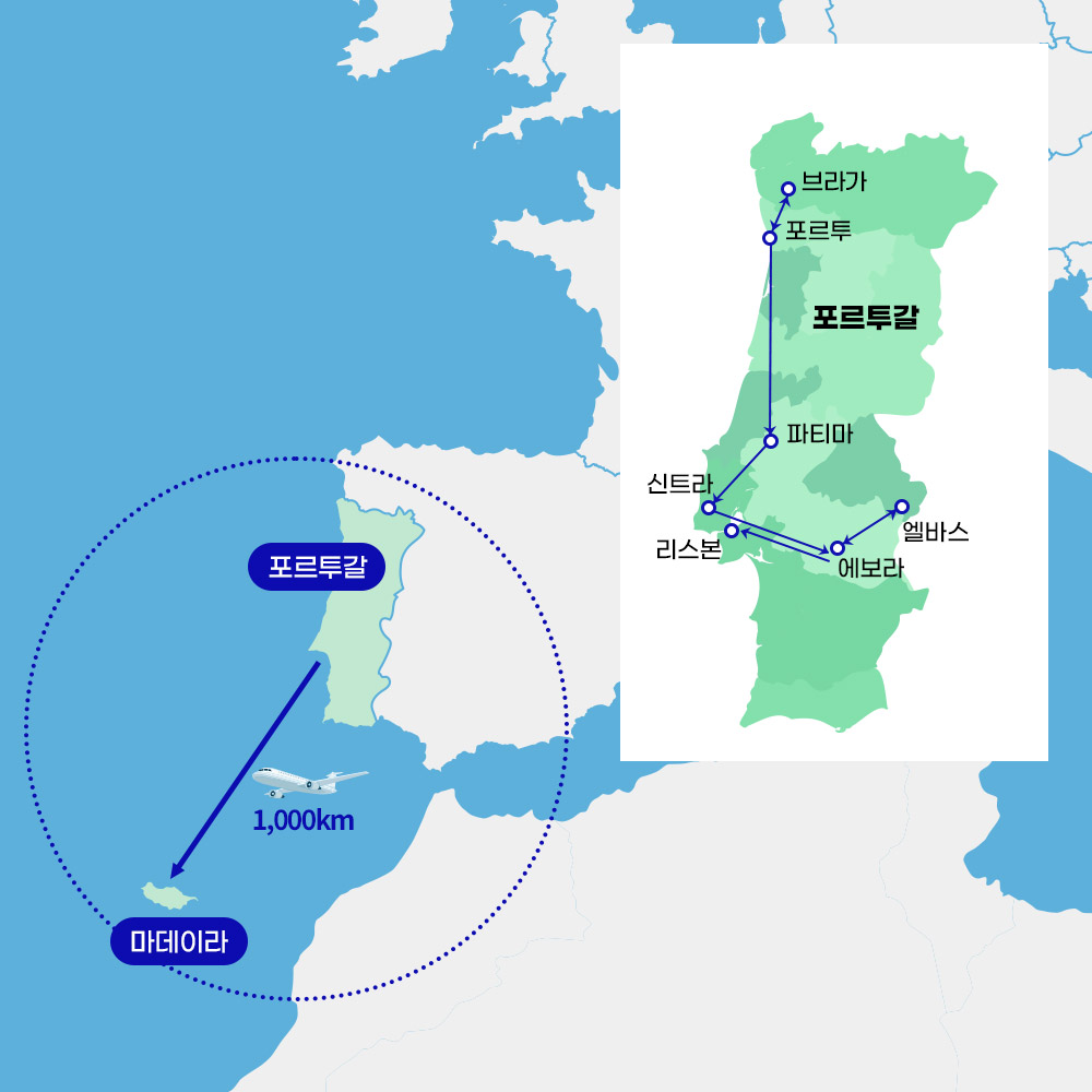셋, 국내선 리스본-푼샬-포르투 구간의 항공료 변동에 따라 여행경비가 변동 될 수 있습니다.