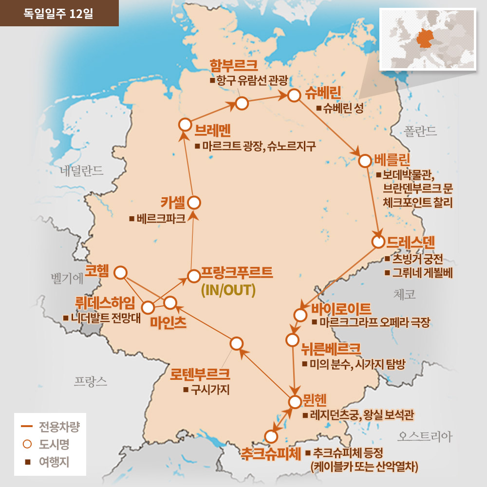 인천-프랑크푸르트-카셀-브레멘-함부르크-슈베린-베를린-드레스덴-바이로이트-뉘른베르크-뮌헨-추크슈피체-로텐부르크-뷔르츠부르크-다름슈타트-코블렌츠-뤼데스하임-프랑크푸르트-인천