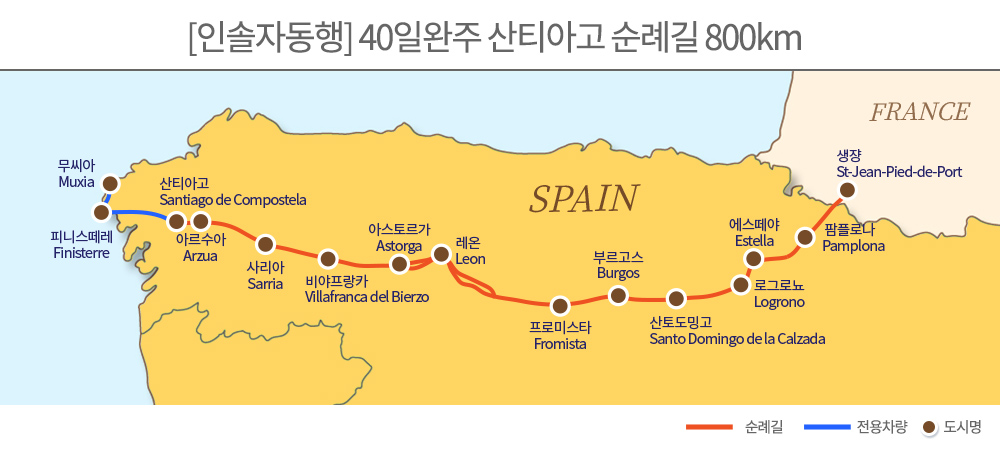 -인천을 출발하여 생쟝에 도착하기 까지, 순례를 마치고 산티아고에서 귀국할때 까지의 교통편을 제공하고 안내를 합니다.