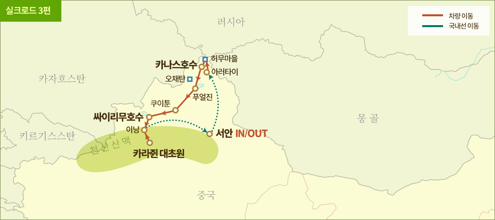 인천-서안-알타이-허무-카나스-푸얼진-쿠이툰-싸이리무-이닝-카라쥔-서안-인천