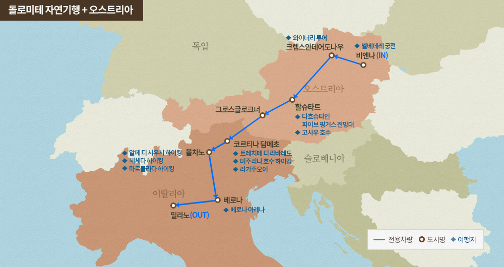 인천-비엔나-크렘스안데어도나우-바트이슐-젤암제-그로스글로크너-코르티나담페초-셀바-베로나-밀라노-인천