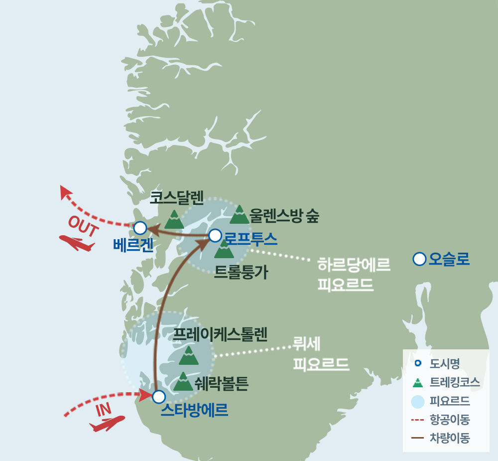 인천- 스타방에르 - 쉐락볼튼 - 프레이케스톨렌 - 휴즈달렌 - 트롤퉁가 - 베르겐 - 인천