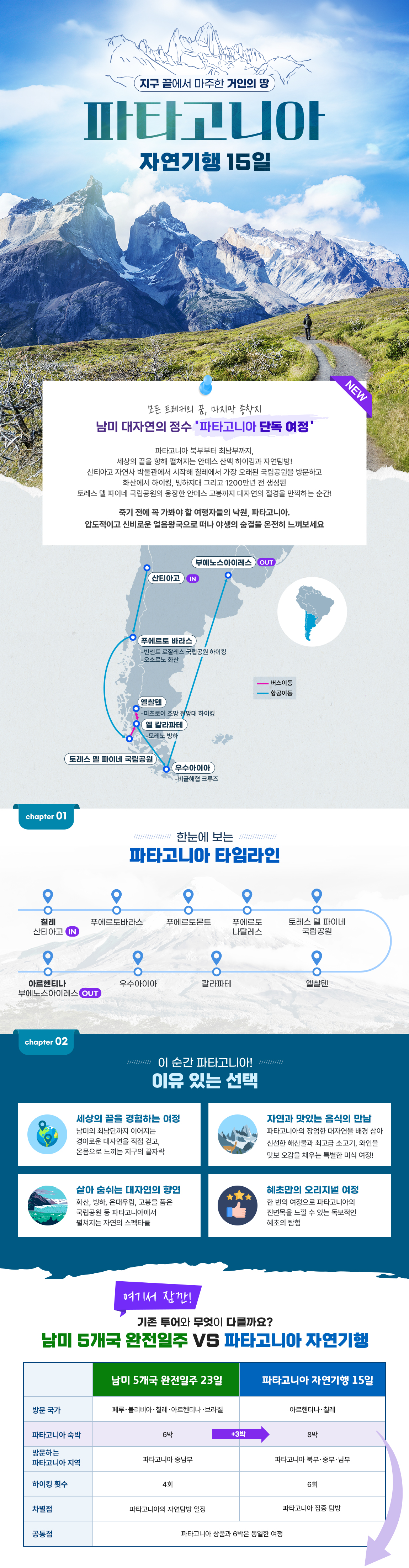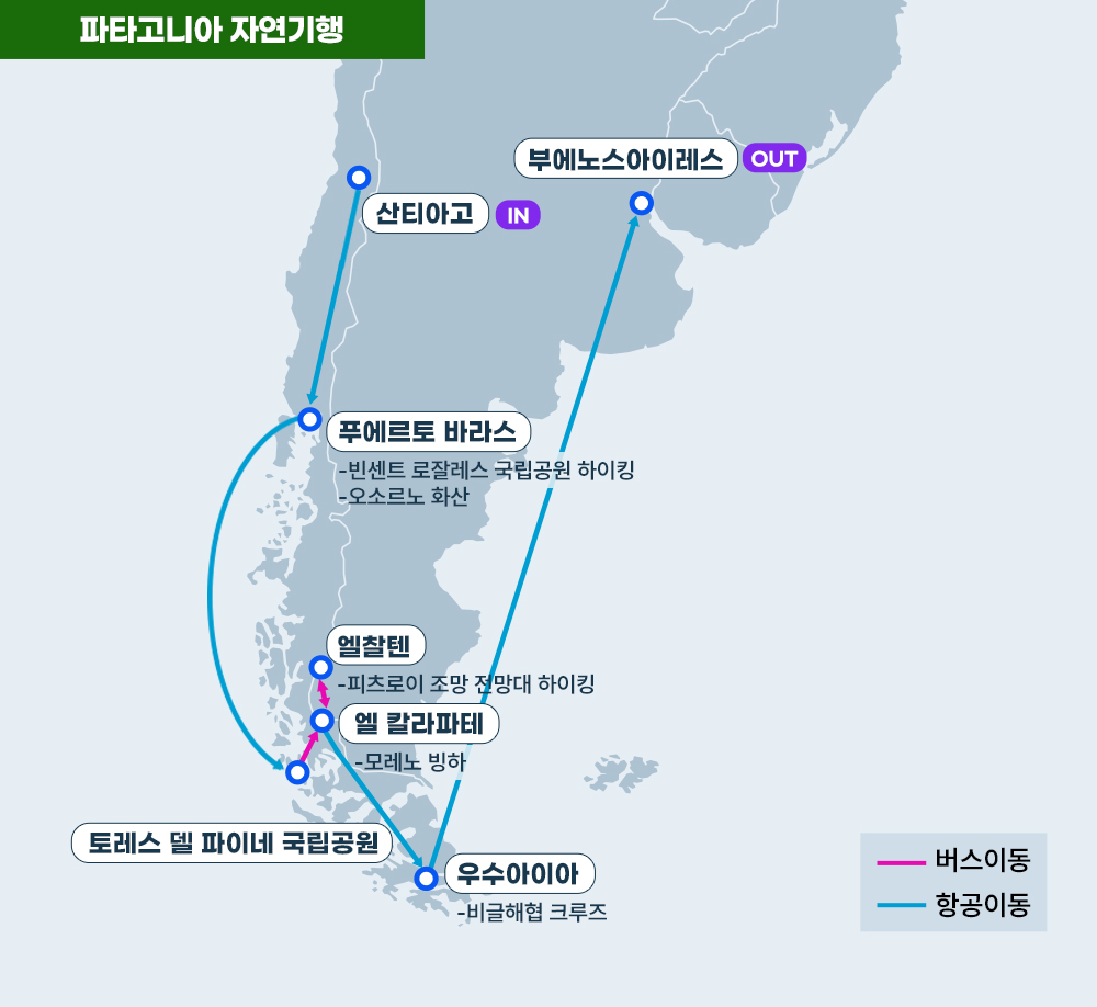 인천-산티아고(칠레)-푸에르토몬트-푸에르토 바라스-푸에르토몬트-푸에르토나탈레스-토레스델파이네-엘찰텐-칼라파테-우수아이아-부에노스아이레스-인천