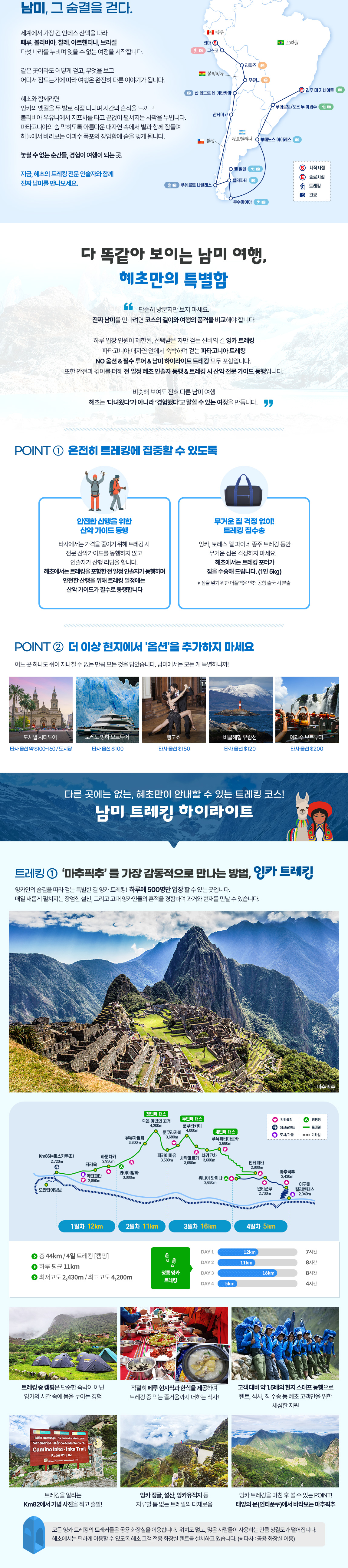 잉카트레킹과 토레스 델 파이네 트레킹은 물론 남미 5개국 관광까지 모두 아우르는 여정