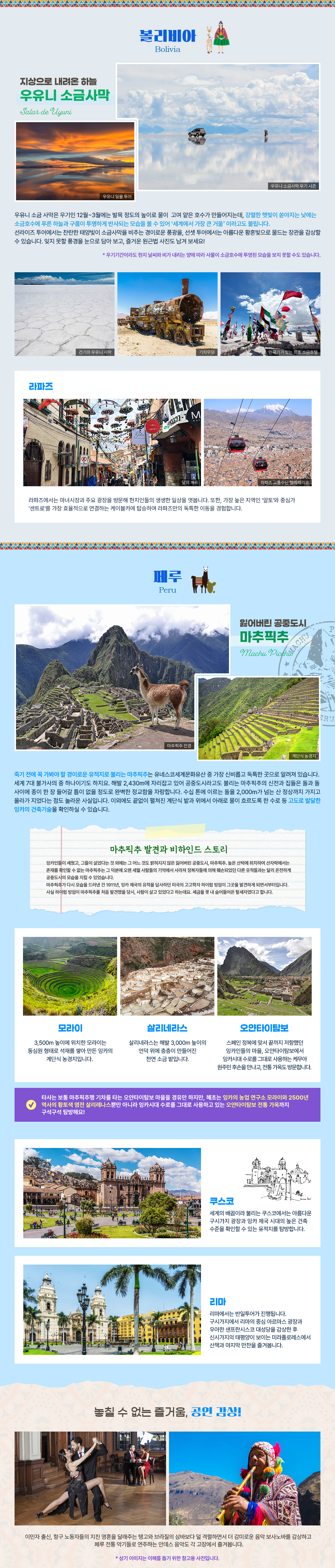 ■ 우유니 소금사막 선라이즈+선셋투어, 비글해협 크루즈투어, 이과수 헬기투어 등 다채로운 투어 포함