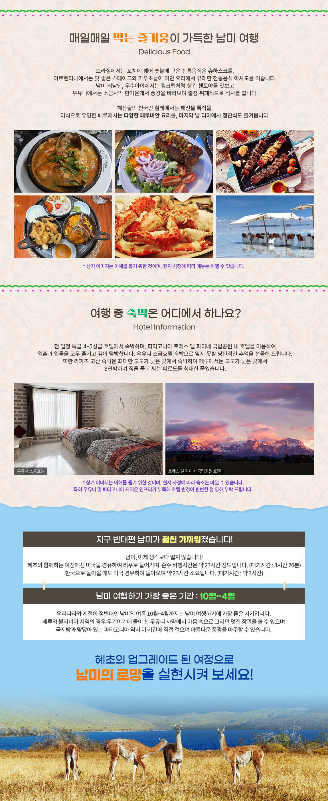 2. 남미 상품 예약시에는 출발일 기준 6개월 유효기간이 남아있는 여권상 정확한 영문명으로만 항공권 예약이 정상 진행되며,
