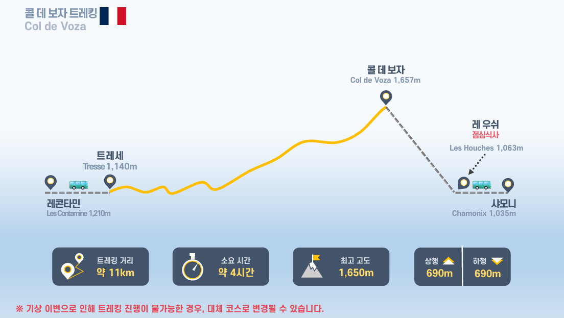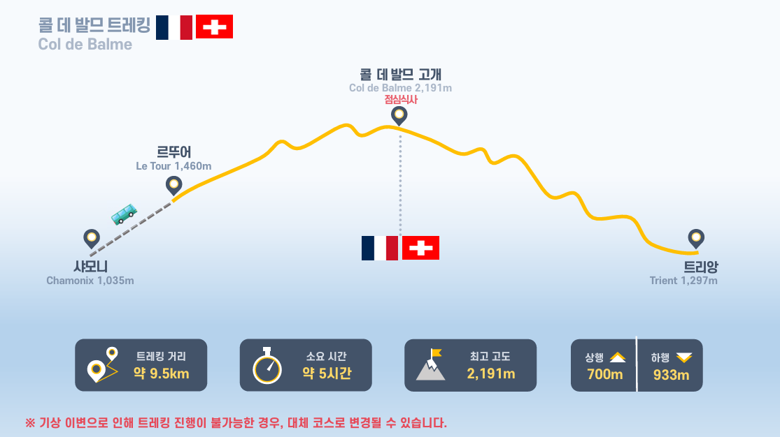 ▶ 오르막길을 오르면서 몽블랑과 그랑조라스 남면, 빙하와 페레계곡을 조망하며 몽데라삭스 능선의 허리를 걷는 코스입니다.