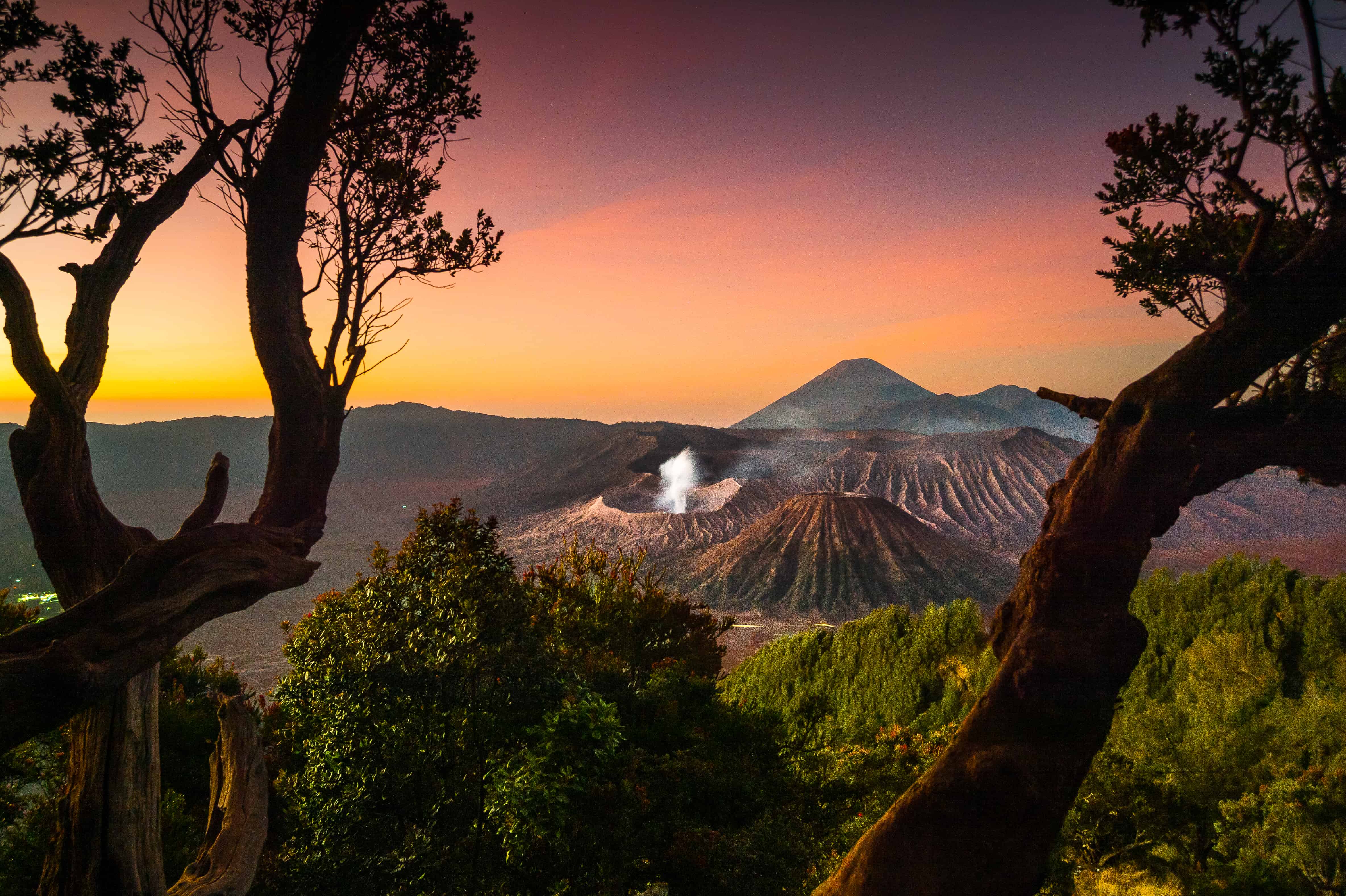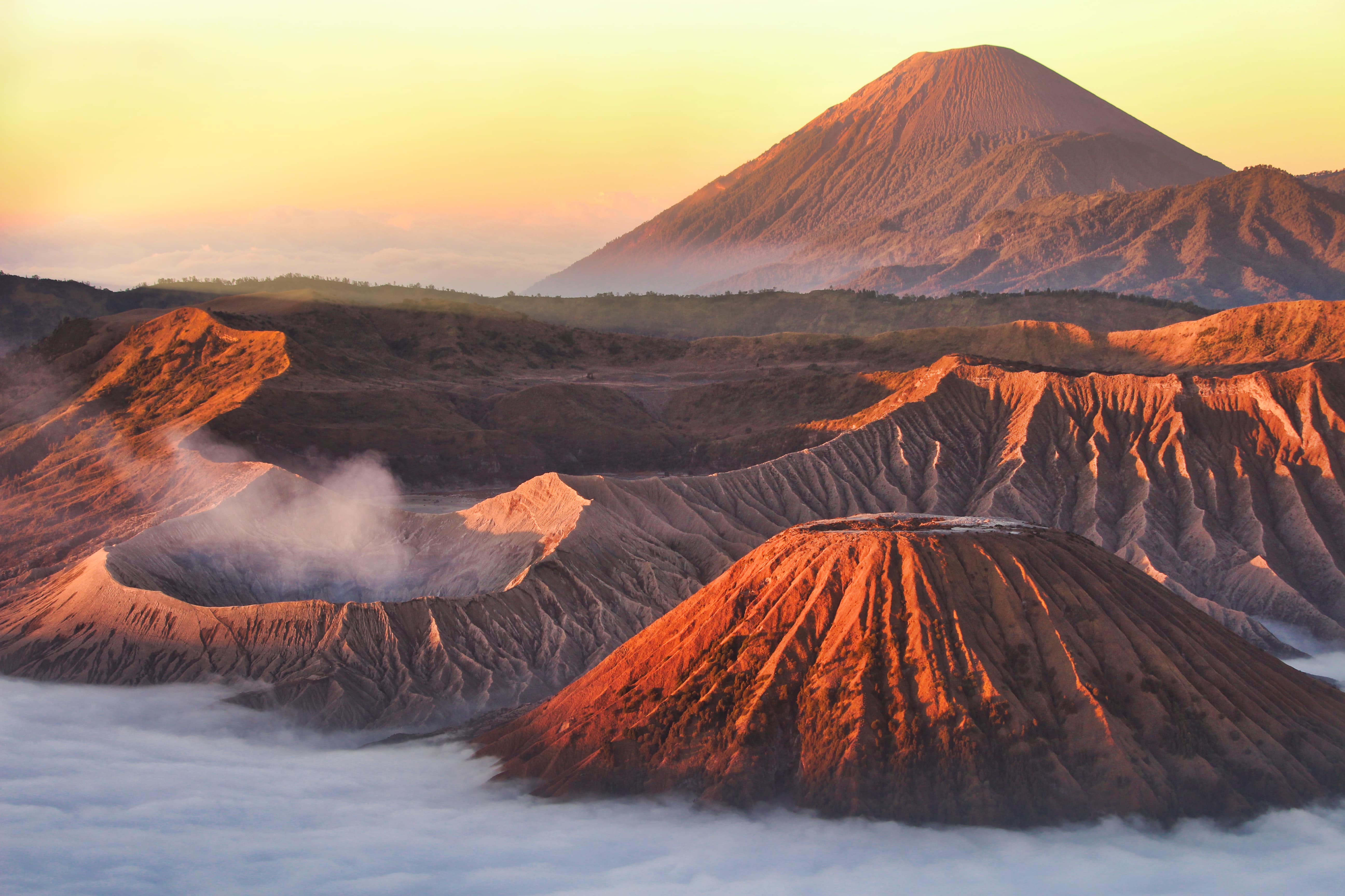 브로모 화산은 인도네시아 자바 섬 동쪽에 있는 쩨모로 라왕이라는 산골에 있는 원추형 활화산입니다. 평상시에도 가스를 분출하며 해발고도가 비교적 낮아 보이지만 2,000m를 넘는 2,393m의 산입니다. 이 일대에 살고 있는 소수민족인 텡거족들은 물론 자바 섬의 다른 지역에 살고 있는 많은 사람들까지 이 산에 불의 신이 살고 있다고 믿고 있어 성스러운 산이라고 말합니다. 해마다 25만명 이상이 해돋이를 보기 위해 찾는 관광지이기도 합니다.