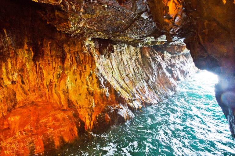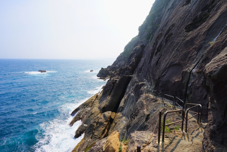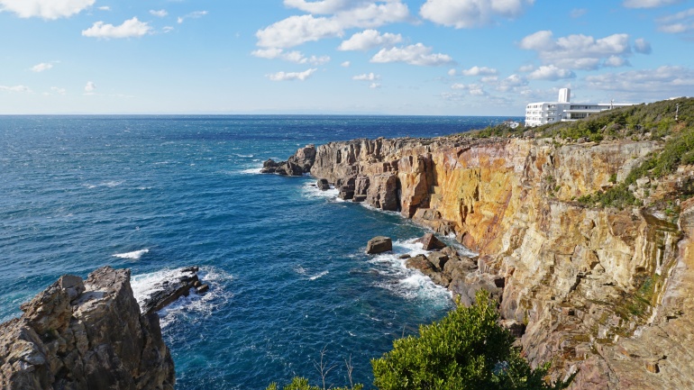 오니가죠는 지진에 의한 융기와 풍화와 파도의 침식에 의해 만들어진 응회암의 해안벽으로,