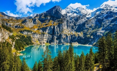 ▲ 눈 덮인 알프스 산맥이 둘러싼 청록빛 외시넨 호수는 스위스에서 가장 아름다운 산악 호수로 손꼽힙니다.